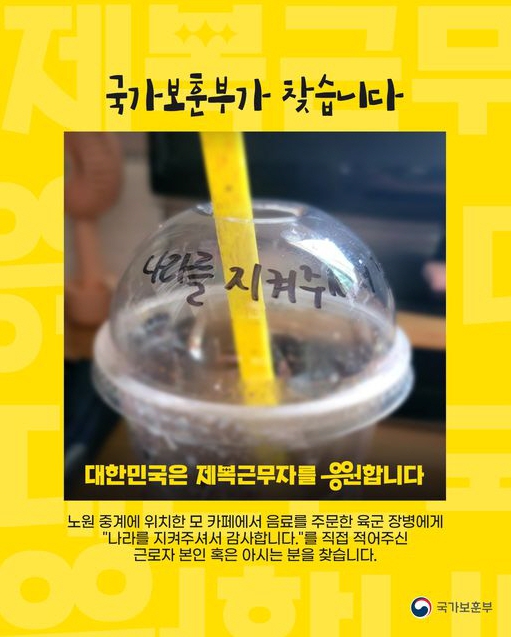 국가보훈부는 2023년 10월 6일 페이스북을 통해 "서울 노원구 중계동의 모 카페에서 음료를 주문한 육군 장병에게 '나라를 지켜주셔서 감사합니다'라는 문구를 적어준 직원분을 찾는다"고 공지했습니다.